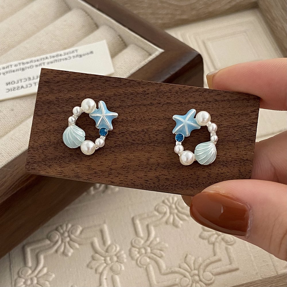 One earring features a golden-rimmed shell. the other a graceful starfish—both accented with a pearl for a unique asymmetrical look.
